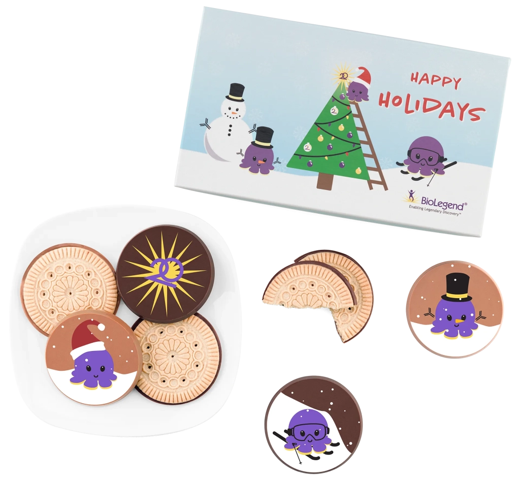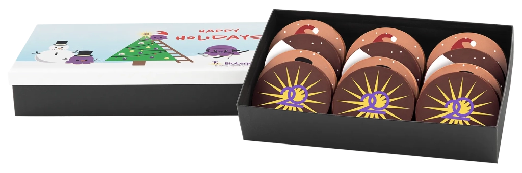 Known for its high quality products, excellent customer service and focus on custom solutions, it made sense for BioLegend to partner with Totally Chocolate, a family business with decades of experience in Premium Custom Chocolate Gifting. True to BioLegend’s founding vision of collaboration with its researchers, the teams worked together to design a fun and playful 12 piece multicolored assortment to create a memorable thank you gift for its employees and customers. Totally Chocolate’s art team collaborated with BioLegend’s design team to creatively integrate the brand’s signature colors, purple and gold, into various motifs of the final product. This one-of-a-kind client gift was thoughtful, eye-catching and memorable. What a wonderful way to celebrate the holiday season and to commemorate 20 years of success!