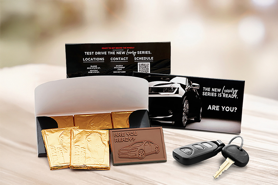 - Product launches – Hand out branded chocolate bars that tie into your theme.