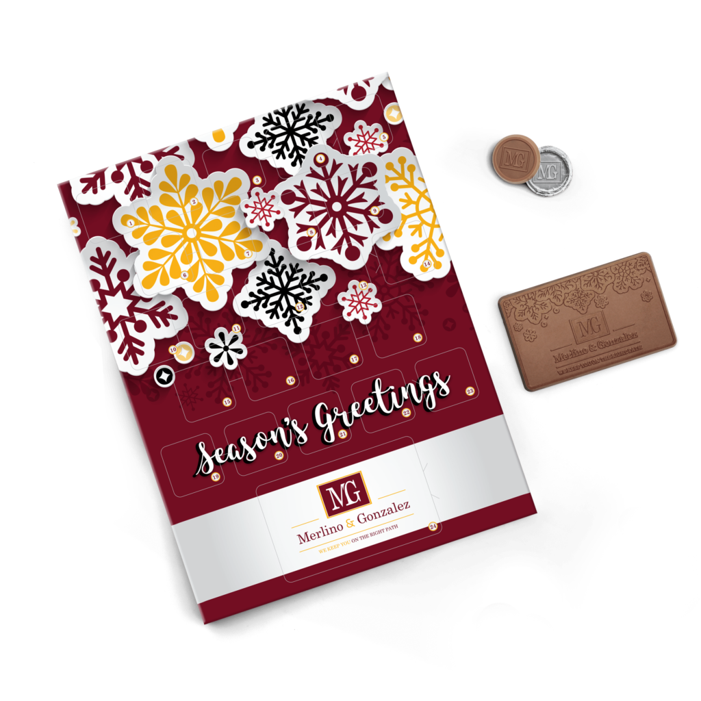 As a family business with decades of experience in law, it made sense for Merlino & Gonzalez to partner with Totally Chocolate, a family business with decades of experience in Custom Chocolate Gifting. Since 2017, Totally Chocolate has helped Merlino & Gonzalez consistently deliver their message: “We Keep You On The Right Path”. The relationship started with Totally Chocolate’s top selling 2LB chocolate bars and 45 piece ensembles to make a big first impression. As Totally Chocolate continued to innovate and branch out with new products, the team at Merlino & Gonzalez found new ways to show their appreciation with advent calendars, premium color cookies, and in-house printed packaging featuring silver, gold and metallics. Totally Chocolate is proud to help Merlino & Gonzalez deliver amazing moments of joy and delight year after year.